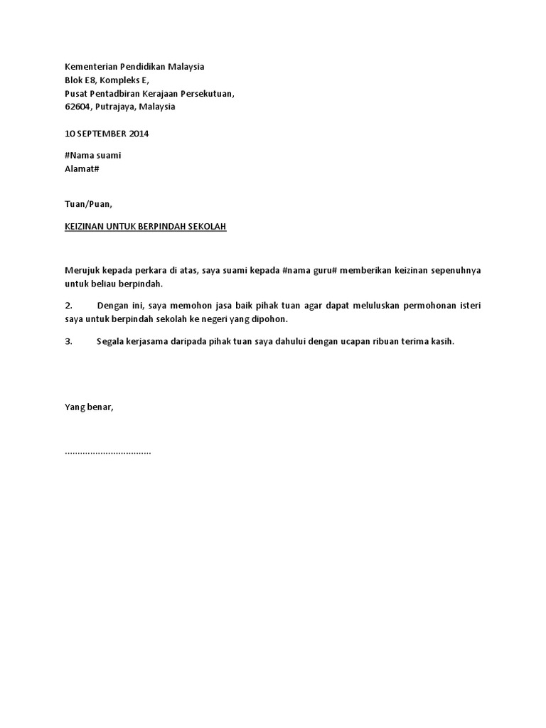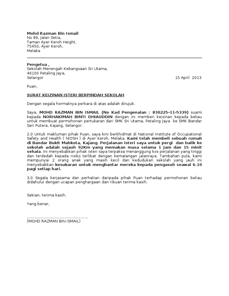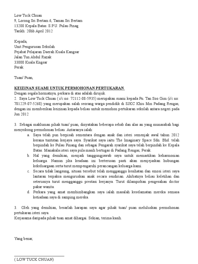 Contoh Surat Izin Suami Untuk Memohon Pertukaran Sekolah Collingjb